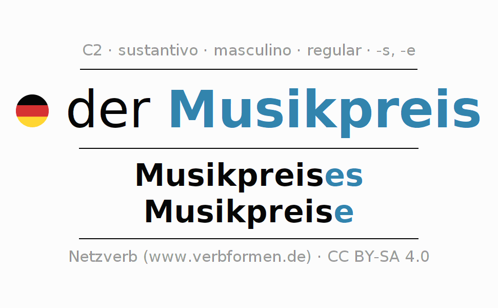 La declinación del sustantivo en forma de tabla con todas su formas: singular, plural y en los cuatro casos: nominativo (primer caso), genitivo (segundo caso), dativo (tercer caso) y acusativo (cuarto caso). Las construcciones gramaticales están representadas de forma clara en una tabla sinópica. La inflexión de los sustantivos es una ayuda durante tareas, exámenes, para cursos de alemán, la universidad, el estudio del alemán como lengua extranjera o como segundo idioma y para estudiantes adultos. La declinación correcta de las palabras es especialmente importante para los que aprenden el idioma alemán. Aquí encontraras más información acerca del tema Wiktionary Musikpreis y aquí también a través del Duden Musikpreis.