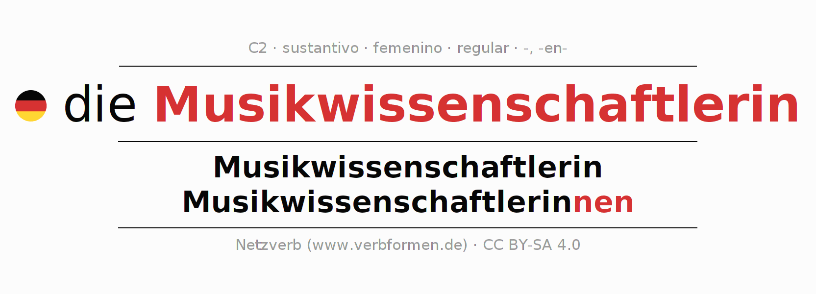 La declinación del sustantivo en forma de tabla con todas su formas: singular, plural y en los cuatro casos: nominativo (primer caso), genitivo (segundo caso), dativo (tercer caso) y acusativo (cuarto caso). Las construcciones gramaticales están representadas de forma clara en una tabla sinópica. La inflexión de los sustantivos es una ayuda durante tareas, exámenes, para cursos de alemán, la universidad, el estudio del alemán como lengua extranjera o como segundo idioma y para estudiantes adultos. La declinación correcta de las palabras es especialmente importante para los que aprenden el idioma alemán. Aquí encontraras más información acerca del tema Wiktionary Musikwissenschaftlerin y aquí también a través del Duden Musikwissenschaftlerin.