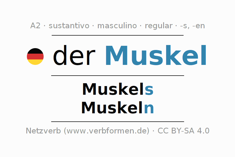 La declinación del sustantivo en forma de tabla con todas su formas: singular, plural y en los cuatro casos: nominativo (primer caso), genitivo (segundo caso), dativo (tercer caso) y acusativo (cuarto caso). Las construcciones gramaticales están representadas de forma clara en una tabla sinópica. La inflexión de los sustantivos es una ayuda durante tareas, exámenes, para cursos de alemán, la universidad, el estudio del alemán como lengua extranjera o como segundo idioma y para estudiantes adultos. La declinación correcta de las palabras es especialmente importante para los que aprenden el idioma alemán. Aquí encontraras más información acerca del tema Wiktionary Muskel y aquí también a través del Duden Muskel.
