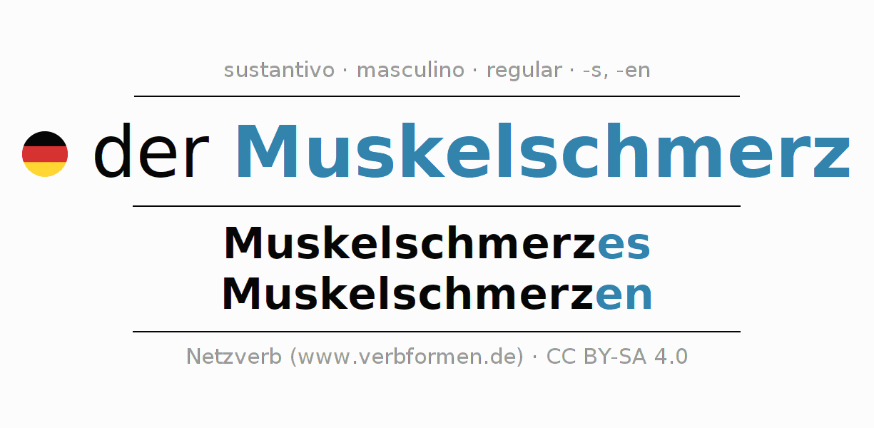 La declinación del sustantivoMuskelschmerz (dolor muscular, mialgia) se encuentra en genitivoMuskelschmerzes del singular y en el nominativoMuskelschmerzen del plural. El sustantivo Muskelschmerz se conjuga de forma mixta con estas terminaciones es/en. El género gramatical de Muskelschmerz es masculino y por eso se requiere el artículo definido ‘der’. Aquí puedes declinar no solamente Muskelschmerz sino también todos los sustantivos alemanes . Comentarios ☆