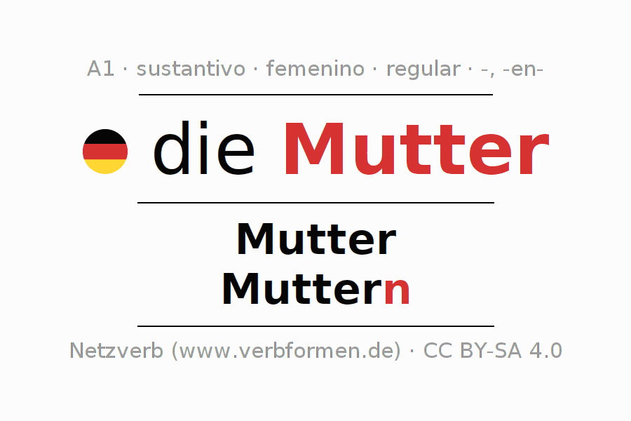 La declinación del sustantivoMutter (tuerca, madre) se encuentra en genitivoMutter del singular y en el nominativoMuttern del plural. El sustantivo Mutter se declina de forma débil con las terminaciones -/n. Pero puede también ser utilizado con otras terminaciones. El género gramatical de Mutter es femenino y por eso se requiere el artículo definido ‘die’. Aquí puedes declinar no solamente Mutter sino también todos los sustantivos alemanes . Este sustantivo pertenece al vocabulario necesario para pasar el examen "Zertifikat Deutsch" o para el nivel A1. Comentarios ☆