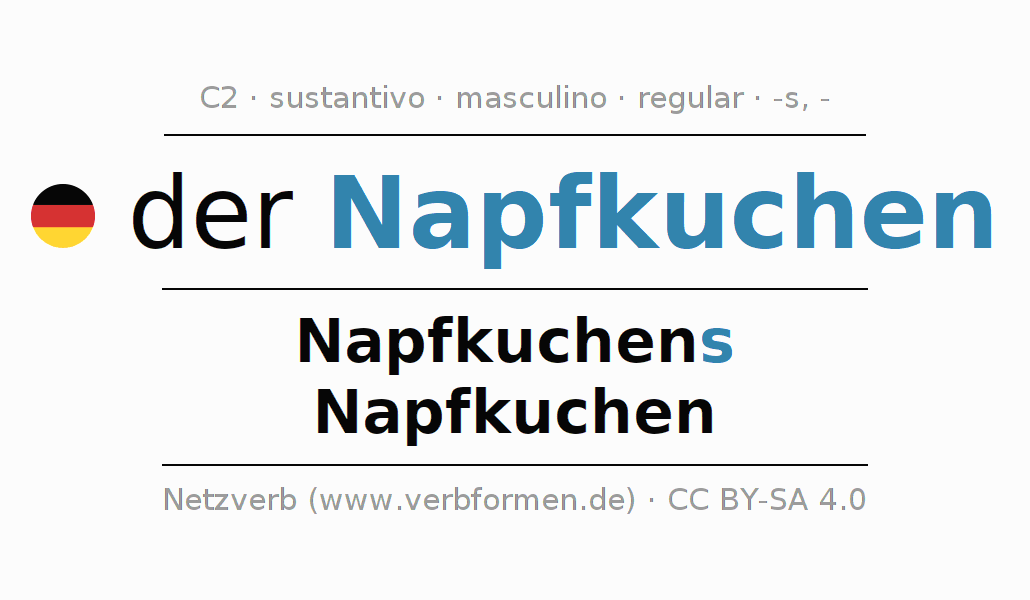La declinación del sustantivo en forma de tabla con todas su formas: singular, plural y en los cuatro casos: nominativo (primer caso), genitivo (segundo caso), dativo (tercer caso) y acusativo (cuarto caso). Las construcciones gramaticales están representadas de forma clara en una tabla sinópica. La inflexión de los sustantivos es una ayuda durante tareas, exámenes, para cursos de alemán, la universidad, el estudio del alemán como lengua extranjera o como segundo idioma y para estudiantes adultos. La declinación correcta de las palabras es especialmente importante para los que aprenden el idioma alemán. Aquí encontraras más información acerca del tema Wiktionary Napfkuchen y aquí también a través del Duden Napfkuchen.