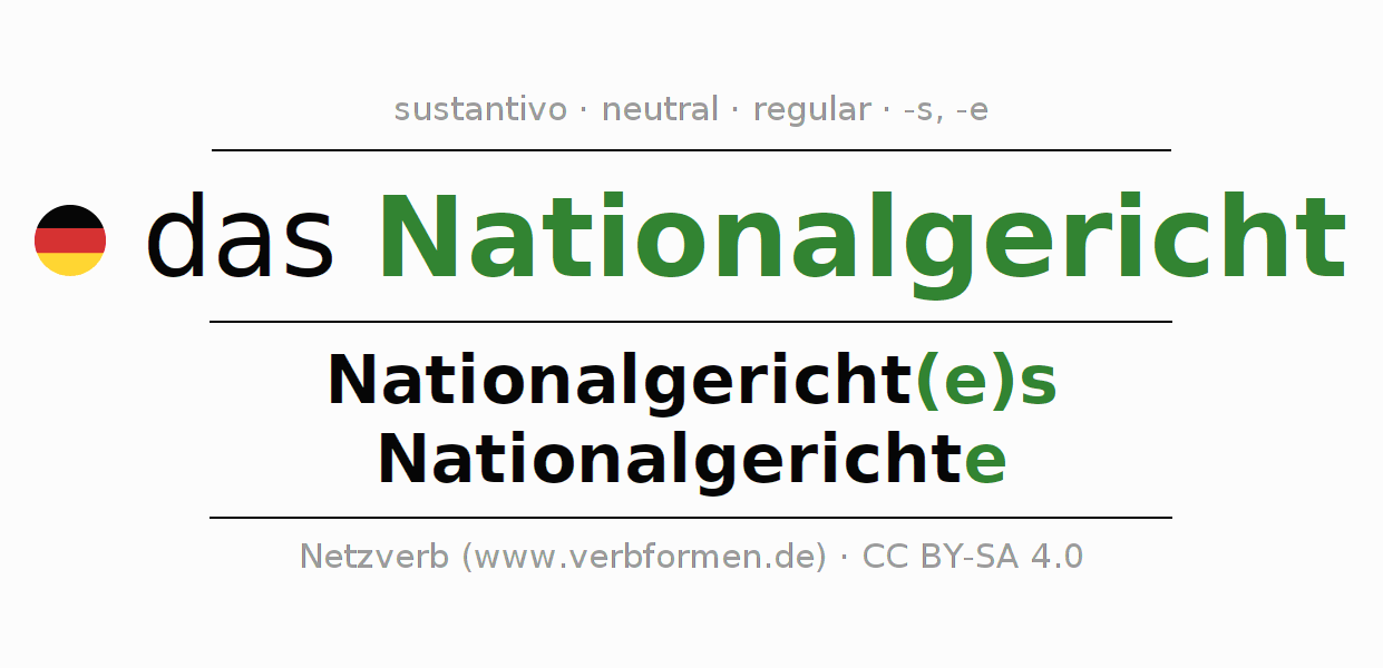 La declinación del sustantivo en forma de tabla con todas su formas: singular, plural y en los cuatro casos: nominativo (primer caso), genitivo (segundo caso), dativo (tercer caso) y acusativo (cuarto caso). Las construcciones gramaticales están representadas de forma clara en una tabla sinópica. La inflexión de los sustantivos es una ayuda durante tareas, exámenes, para cursos de alemán, la universidad, el estudio del alemán como lengua extranjera o como segundo idioma y para estudiantes adultos. La declinación correcta de las palabras es especialmente importante para los que aprenden el idioma alemán. Aquí encontraras más información acerca del tema Wiktionary Nationalgericht y aquí también a través del Duden Nationalgericht.