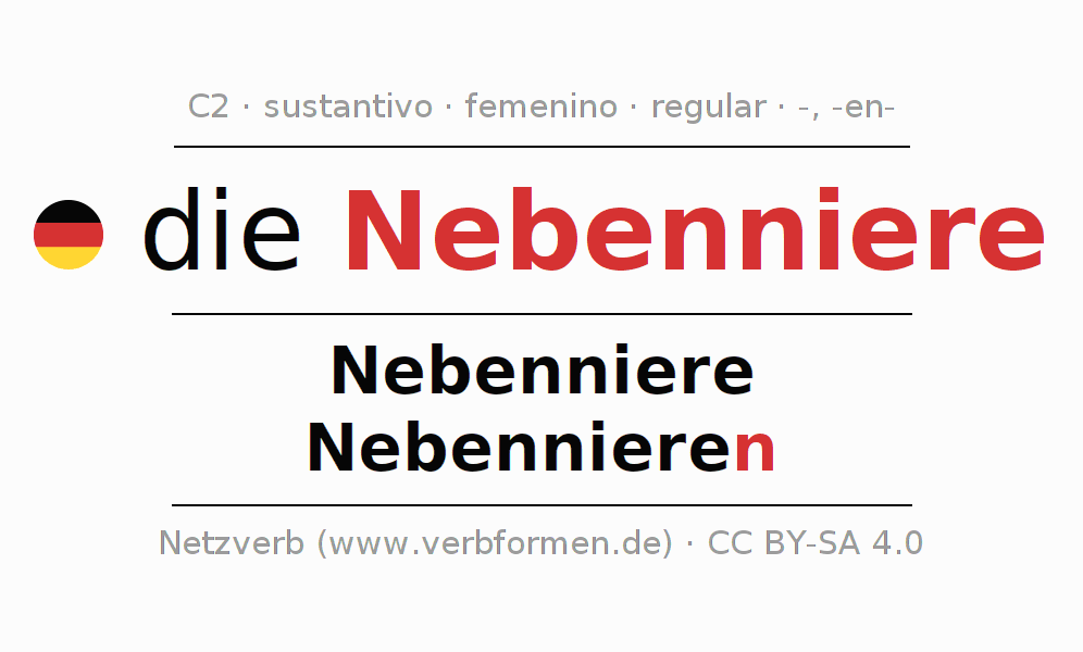 La declinación del sustantivo en forma de tabla con todas su formas: singular, plural y en los cuatro casos: nominativo (primer caso), genitivo (segundo caso), dativo (tercer caso) y acusativo (cuarto caso). Las construcciones gramaticales están representadas de forma clara en una tabla sinópica. La inflexión de los sustantivos es una ayuda durante tareas, exámenes, para cursos de alemán, la universidad, el estudio del alemán como lengua extranjera o como segundo idioma y para estudiantes adultos. La declinación correcta de las palabras es especialmente importante para los que aprenden el idioma alemán. Aquí encontraras más información acerca del tema Wiktionary Nebenniere y aquí también a través del Duden Nebenniere.