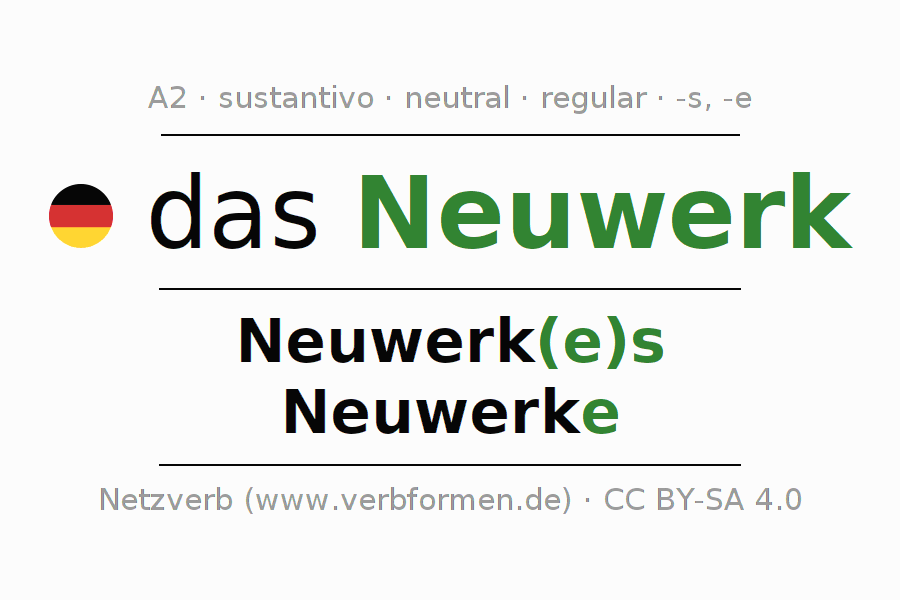 La declinación del sustantivo en forma de tabla con todas su formas: singular, plural y en los cuatro casos: nominativo (primer caso), genitivo (segundo caso), dativo (tercer caso) y acusativo (cuarto caso). Las construcciones gramaticales están representadas de forma clara en una tabla sinópica. La inflexión de los sustantivos es una ayuda durante tareas, exámenes, para cursos de alemán, la universidad, el estudio del alemán como lengua extranjera o como segundo idioma y para estudiantes adultos. La declinación correcta de las palabras es especialmente importante para los que aprenden el idioma alemán. Aquí encontraras más información acerca del tema Wiktionary Neuwerk y aquí también a través del Duden Neuwerk.