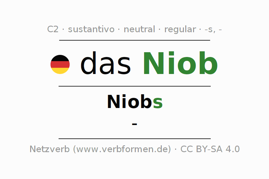 La declinación del sustantivoNiob (niobio) se encuentra en genitivoNiobs del singular y en el nominativo- del plural. El sustantivo Niob se conjuga de forma fuerte (irregular) con estas terminaciones s/-. No permite construcciones en plural. El género gramatical de Niob es neutro y por eso se requiere el artículo definido ‘das’. Aquí puedes declinar no solamente Niob sino también todos los sustantivos alemanes . Este sustantivo pertenece al vocabulario necesario para pasar el examen "Zertifikat Deutsch" o para el nivel C2. Comentarios ☆