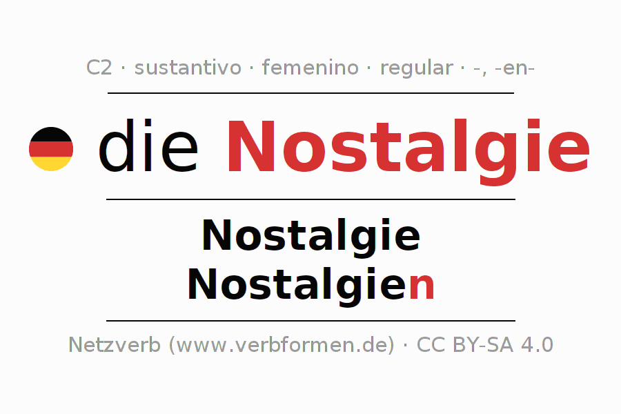 La declinación del sustantivo en forma de tabla con todas su formas: singular, plural y en los cuatro casos: nominativo (primer caso), genitivo (segundo caso), dativo (tercer caso) y acusativo (cuarto caso). Las construcciones gramaticales están representadas de forma clara en una tabla sinópica. La inflexión de los sustantivos es una ayuda durante tareas, exámenes, para cursos de alemán, la universidad, el estudio del alemán como lengua extranjera o como segundo idioma y para estudiantes adultos. La declinación correcta de las palabras es especialmente importante para los que aprenden el idioma alemán. Aquí encontraras más información acerca del tema Wiktionary Nostalgie y aquí también a través del Duden Nostalgie.