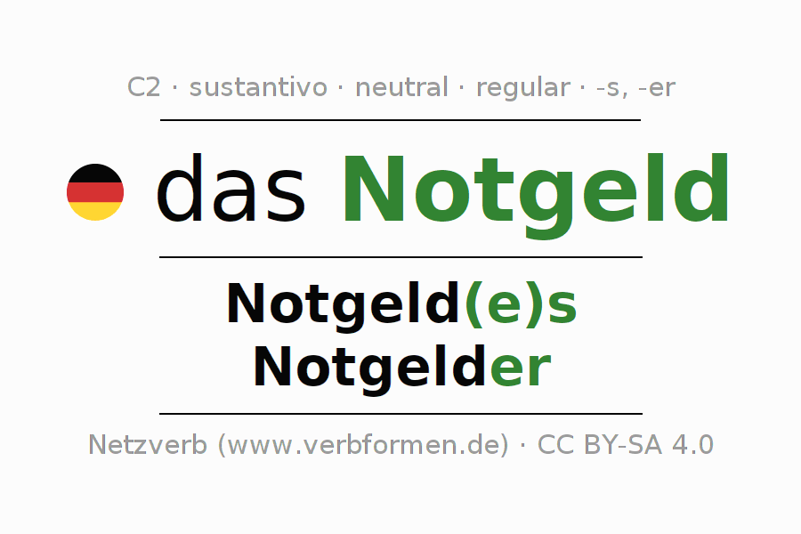 La declinación del sustantivoNotgeld (dinero de emergencia, moneda de emergencia) se encuentra en genitivoNotgeld(e)s del singular y en el nominativoNotgelder del plural. El sustantivo Notgeld se conjuga de forma fuerte (irregular) con estas terminaciones es/er. El género gramatical de Notgeld es neutro y por eso se requiere el artículo definido ‘das’. Aquí puedes declinar no solamente Notgeld sino también todos los sustantivos alemanes . Este sustantivo pertenece al vocabulario necesario para pasar el examen "Zertifikat Deutsch" o para el nivel C2. Comentarios ☆