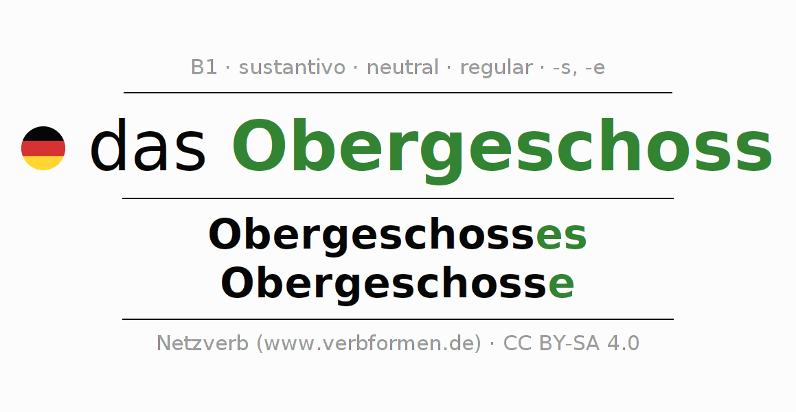 La declinación del sustantivo en forma de tabla con todas su formas: singular, plural y en los cuatro casos: nominativo (primer caso), genitivo (segundo caso), dativo (tercer caso) y acusativo (cuarto caso). Las construcciones gramaticales están representadas de forma clara en una tabla sinópica. La inflexión de los sustantivos es una ayuda durante tareas, exámenes, para cursos de alemán, la universidad, el estudio del alemán como lengua extranjera o como segundo idioma y para estudiantes adultos. La declinación correcta de las palabras es especialmente importante para los que aprenden el idioma alemán. Aquí encontraras más información acerca del tema Wiktionary Obergeschoss y aquí también a través del Duden Obergeschoss.