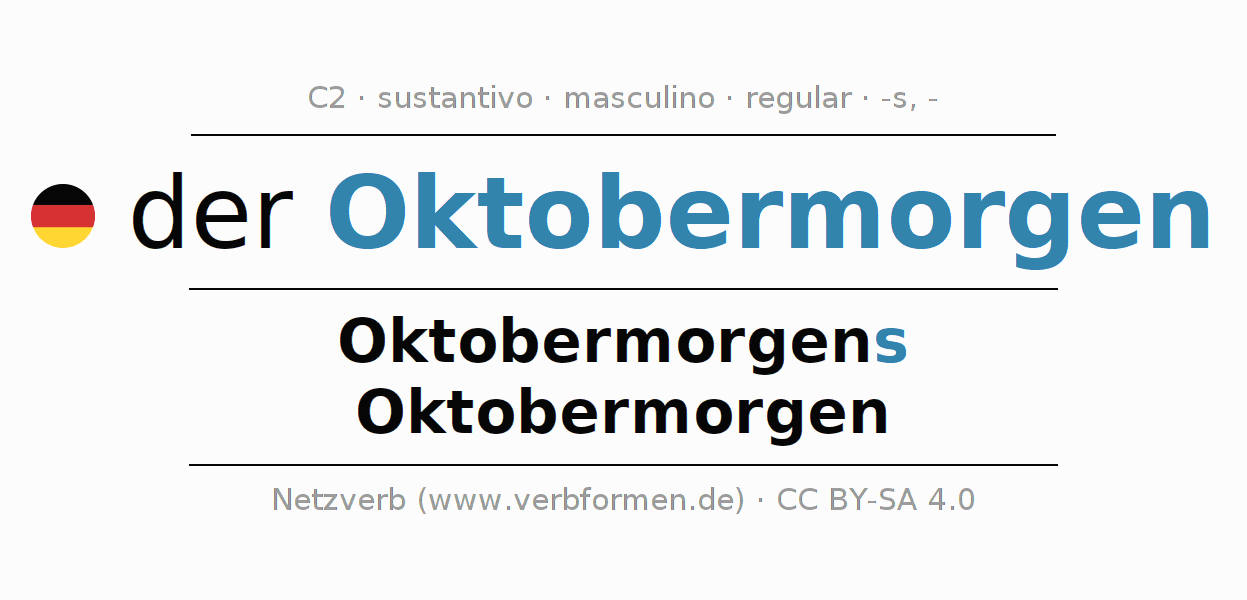 La declinación del sustantivo en forma de tabla con todas su formas: singular, plural y en los cuatro casos: nominativo (primer caso), genitivo (segundo caso), dativo (tercer caso) y acusativo (cuarto caso). Las construcciones gramaticales están representadas de forma clara en una tabla sinópica. La inflexión de los sustantivos es una ayuda durante tareas, exámenes, para cursos de alemán, la universidad, el estudio del alemán como lengua extranjera o como segundo idioma y para estudiantes adultos. La declinación correcta de las palabras es especialmente importante para los que aprenden el idioma alemán. Aquí encontraras más información acerca del tema Wiktionary Oktobermorgen y aquí también a través del Duden Oktobermorgen.