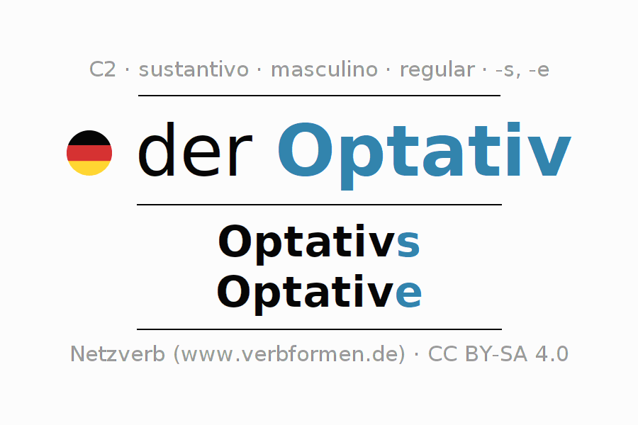 La declinación del sustantivo en forma de tabla con todas su formas: singular, plural y en los cuatro casos: nominativo (primer caso), genitivo (segundo caso), dativo (tercer caso) y acusativo (cuarto caso). Las construcciones gramaticales están representadas de forma clara en una tabla sinópica. La inflexión de los sustantivos es una ayuda durante tareas, exámenes, para cursos de alemán, la universidad, el estudio del alemán como lengua extranjera o como segundo idioma y para estudiantes adultos. La declinación correcta de las palabras es especialmente importante para los que aprenden el idioma alemán. Aquí encontraras más información acerca del tema Wiktionary Optativ y aquí también a través del Duden Optativ.