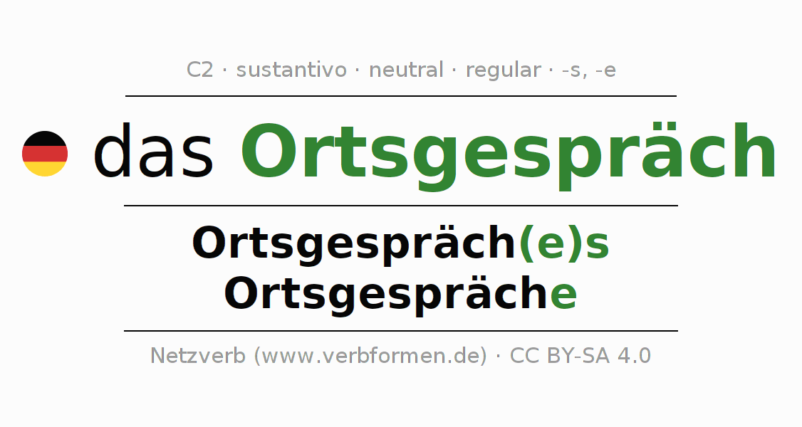 La declinación del sustantivo en forma de tabla con todas su formas: singular, plural y en los cuatro casos: nominativo (primer caso), genitivo (segundo caso), dativo (tercer caso) y acusativo (cuarto caso). Las construcciones gramaticales están representadas de forma clara en una tabla sinópica. La inflexión de los sustantivos es una ayuda durante tareas, exámenes, para cursos de alemán, la universidad, el estudio del alemán como lengua extranjera o como segundo idioma y para estudiantes adultos. La declinación correcta de las palabras es especialmente importante para los que aprenden el idioma alemán. Aquí encontraras más información acerca del tema Wiktionary Ortsgespräch y aquí también a través del Duden Ortsgespräch.