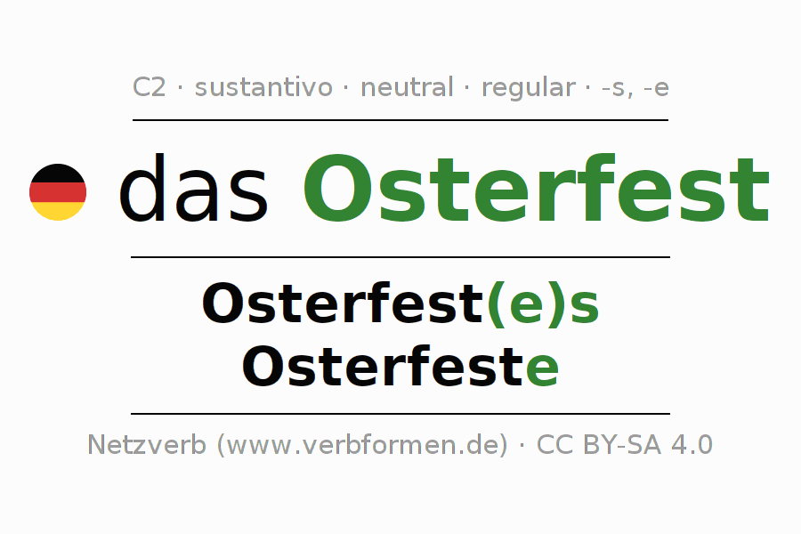 La declinación del sustantivo en forma de tabla con todas su formas: singular, plural y en los cuatro casos: nominativo (primer caso), genitivo (segundo caso), dativo (tercer caso) y acusativo (cuarto caso). Las construcciones gramaticales están representadas de forma clara en una tabla sinópica. La inflexión de los sustantivos es una ayuda durante tareas, exámenes, para cursos de alemán, la universidad, el estudio del alemán como lengua extranjera o como segundo idioma y para estudiantes adultos. La declinación correcta de las palabras es especialmente importante para los que aprenden el idioma alemán. Aquí encontraras más información acerca del tema Wiktionary Osterfest y aquí también a través del Duden Osterfest.