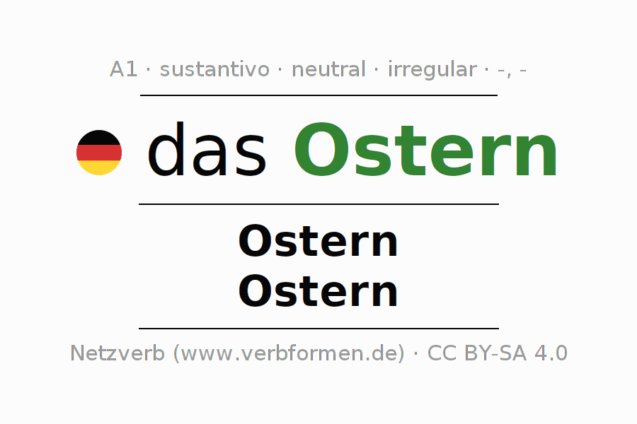 La declinación del sustantivo en forma de tabla con todas su formas: singular, plural y en los cuatro casos: nominativo (primer caso), genitivo (segundo caso), dativo (tercer caso) y acusativo (cuarto caso). Las construcciones gramaticales están representadas de forma clara en una tabla sinópica. La inflexión de los sustantivos es una ayuda durante tareas, exámenes, para cursos de alemán, la universidad, el estudio del alemán como lengua extranjera o como segundo idioma y para estudiantes adultos. La declinación correcta de las palabras es especialmente importante para los que aprenden el idioma alemán. Aquí encontraras más información acerca del tema Wiktionary Ostern y aquí también a través del Duden Ostern.