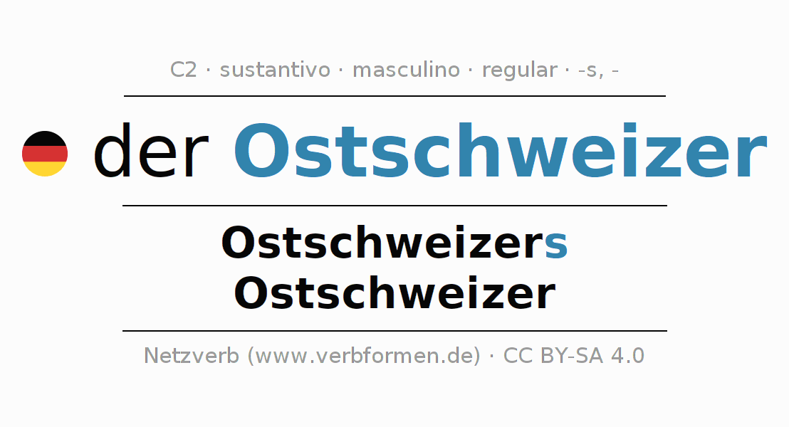 La declinación del sustantivo en forma de tabla con todas su formas: singular, plural y en los cuatro casos: nominativo (primer caso), genitivo (segundo caso), dativo (tercer caso) y acusativo (cuarto caso). Las construcciones gramaticales están representadas de forma clara en una tabla sinópica. La inflexión de los sustantivos es una ayuda durante tareas, exámenes, para cursos de alemán, la universidad, el estudio del alemán como lengua extranjera o como segundo idioma y para estudiantes adultos. La declinación correcta de las palabras es especialmente importante para los que aprenden el idioma alemán. Aquí encontraras más información acerca del tema Wiktionary Ostschweizer y aquí también a través del Duden Ostschweizer.