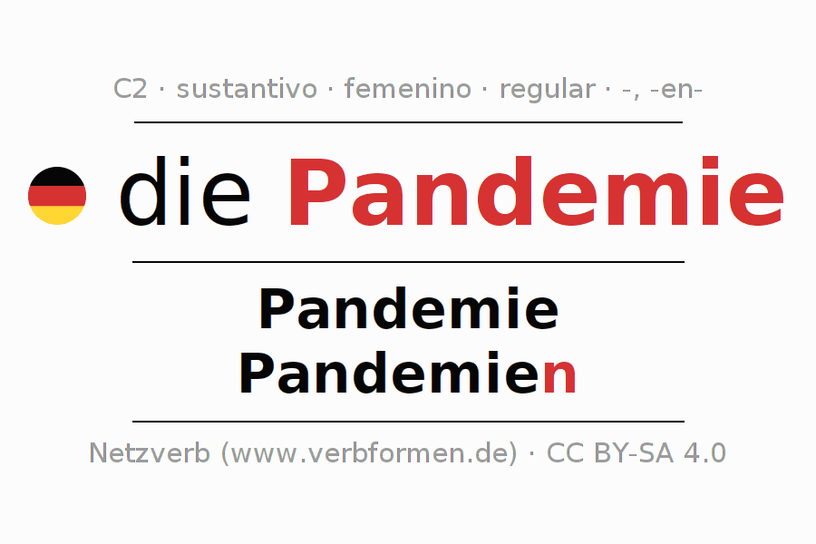 La declinación del sustantivo en forma de tabla con todas su formas: singular, plural y en los cuatro casos: nominativo (primer caso), genitivo (segundo caso), dativo (tercer caso) y acusativo (cuarto caso). Las construcciones gramaticales están representadas de forma clara en una tabla sinópica. La inflexión de los sustantivos es una ayuda durante tareas, exámenes, para cursos de alemán, la universidad, el estudio del alemán como lengua extranjera o como segundo idioma y para estudiantes adultos. La declinación correcta de las palabras es especialmente importante para los que aprenden el idioma alemán. Aquí encontraras más información acerca del tema Wiktionary Pandemie y aquí también a través del Duden Pandemie.