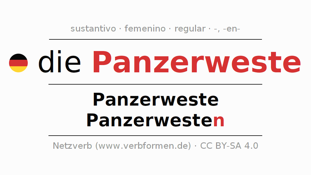 La declinación del sustantivo en forma de tabla con todas su formas: singular, plural y en los cuatro casos: nominativo (primer caso), genitivo (segundo caso), dativo (tercer caso) y acusativo (cuarto caso). Las construcciones gramaticales están representadas de forma clara en una tabla sinópica. La inflexión de los sustantivos es una ayuda durante tareas, exámenes, para cursos de alemán, la universidad, el estudio del alemán como lengua extranjera o como segundo idioma y para estudiantes adultos. La declinación correcta de las palabras es especialmente importante para los que aprenden el idioma alemán. Aquí encontraras más información acerca del tema Wiktionary Panzerweste y aquí también a través del Duden Panzerweste.