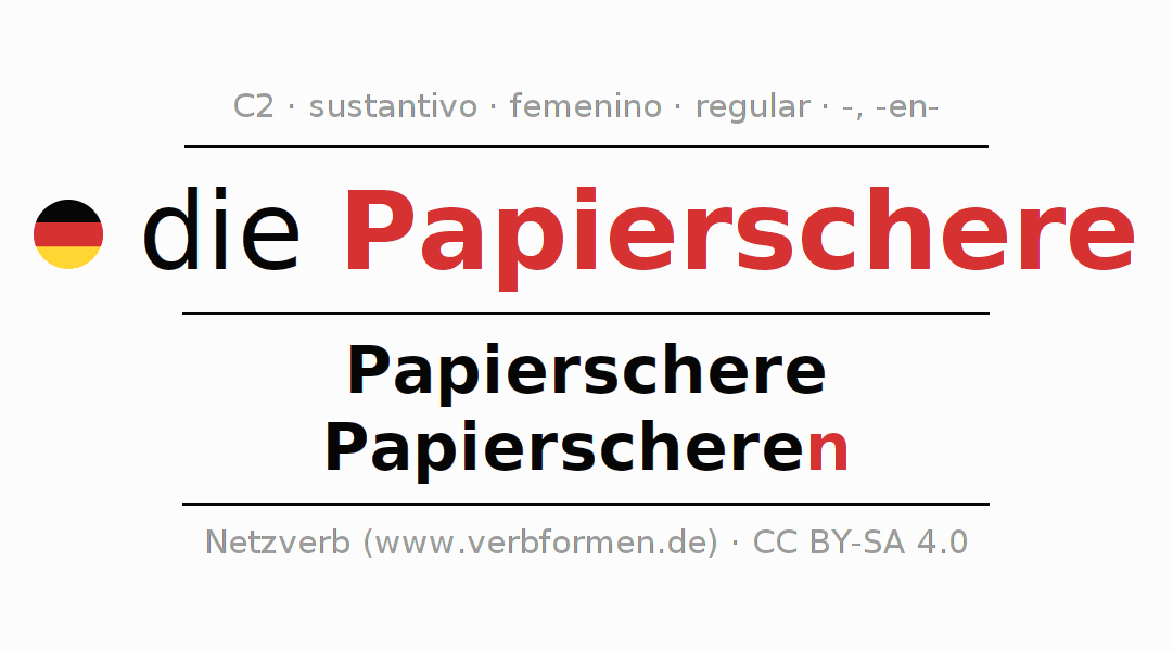 La declinación del sustantivo en forma de tabla con todas su formas: singular, plural y en los cuatro casos: nominativo (primer caso), genitivo (segundo caso), dativo (tercer caso) y acusativo (cuarto caso). Las construcciones gramaticales están representadas de forma clara en una tabla sinópica. La inflexión de los sustantivos es una ayuda durante tareas, exámenes, para cursos de alemán, la universidad, el estudio del alemán como lengua extranjera o como segundo idioma y para estudiantes adultos. La declinación correcta de las palabras es especialmente importante para los que aprenden el idioma alemán. Aquí encontraras más información acerca del tema Wiktionary Papierschere y aquí también a través del Duden Papierschere.