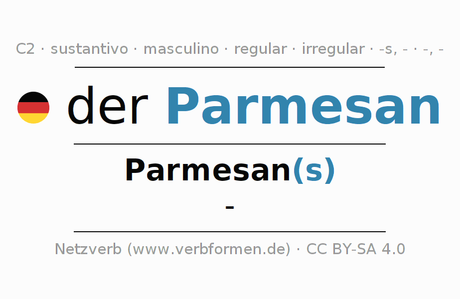La declinación del sustantivoParmesan (parmesano) se encuentra en genitivoParmesan(s) del singular y en el nominativo- del plural. El sustantivo Parmesan se conjuga de forma fuerte (irregular) con estas terminaciones s/-/-. No permite construcciones en plural. El género gramatical de Parmesan es masculino y por eso se requiere el artículo definido ‘der’. Aquí puedes declinar no solamente Parmesan sino también todos los sustantivos alemanes . Este sustantivo pertenece al vocabulario necesario para pasar el examen "Zertifikat Deutsch" o para el nivel C2. Comentarios ☆