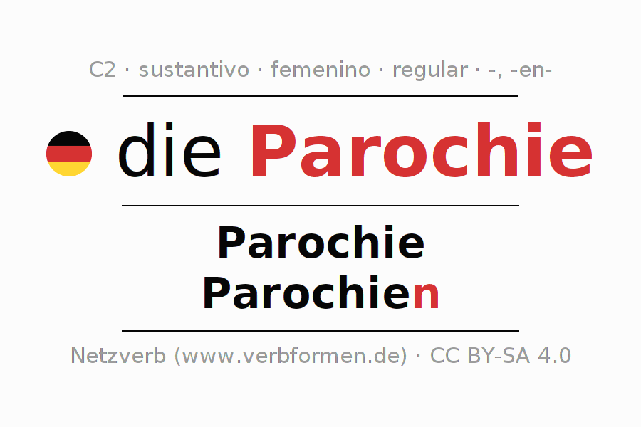 La declinación del sustantivo en forma de tabla con todas su formas: singular, plural y en los cuatro casos: nominativo (primer caso), genitivo (segundo caso), dativo (tercer caso) y acusativo (cuarto caso). Las construcciones gramaticales están representadas de forma clara en una tabla sinópica. La inflexión de los sustantivos es una ayuda durante tareas, exámenes, para cursos de alemán, la universidad, el estudio del alemán como lengua extranjera o como segundo idioma y para estudiantes adultos. La declinación correcta de las palabras es especialmente importante para los que aprenden el idioma alemán. Aquí encontraras más información acerca del tema Wiktionary Parochie y aquí también a través del Duden Parochie.