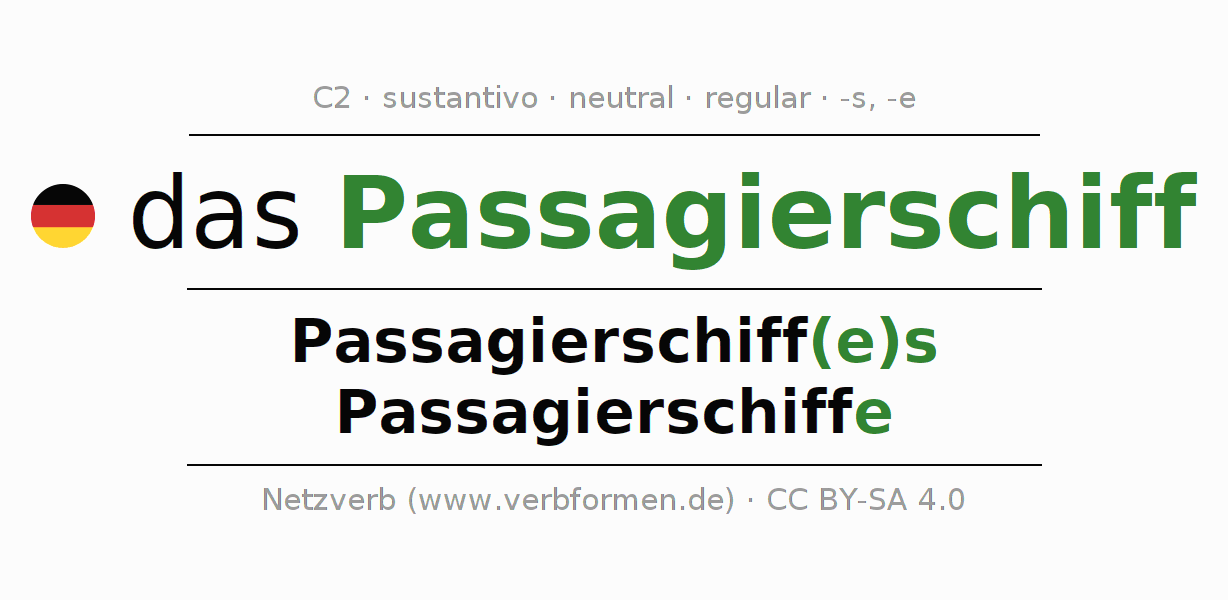 La declinación del sustantivo en forma de tabla con todas su formas: singular, plural y en los cuatro casos: nominativo (primer caso), genitivo (segundo caso), dativo (tercer caso) y acusativo (cuarto caso). Las construcciones gramaticales están representadas de forma clara en una tabla sinópica. La inflexión de los sustantivos es una ayuda durante tareas, exámenes, para cursos de alemán, la universidad, el estudio del alemán como lengua extranjera o como segundo idioma y para estudiantes adultos. La declinación correcta de las palabras es especialmente importante para los que aprenden el idioma alemán. Aquí encontraras más información acerca del tema Wiktionary Passagierschiff y aquí también a través del Duden Passagierschiff.