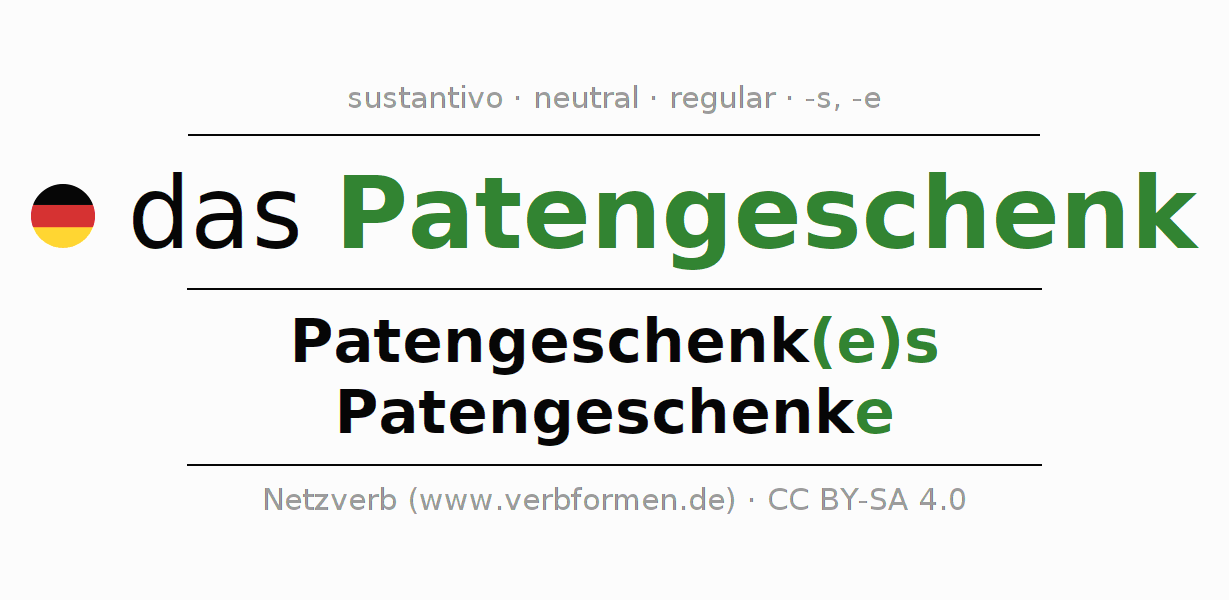 La declinación del sustantivo en forma de tabla con todas su formas: singular, plural y en los cuatro casos: nominativo (primer caso), genitivo (segundo caso), dativo (tercer caso) y acusativo (cuarto caso). Las construcciones gramaticales están representadas de forma clara en una tabla sinópica. La inflexión de los sustantivos es una ayuda durante tareas, exámenes, para cursos de alemán, la universidad, el estudio del alemán como lengua extranjera o como segundo idioma y para estudiantes adultos. La declinación correcta de las palabras es especialmente importante para los que aprenden el idioma alemán. Aquí encontraras más información acerca del tema Wiktionary Patengeschenk y aquí también a través del Duden Patengeschenk.