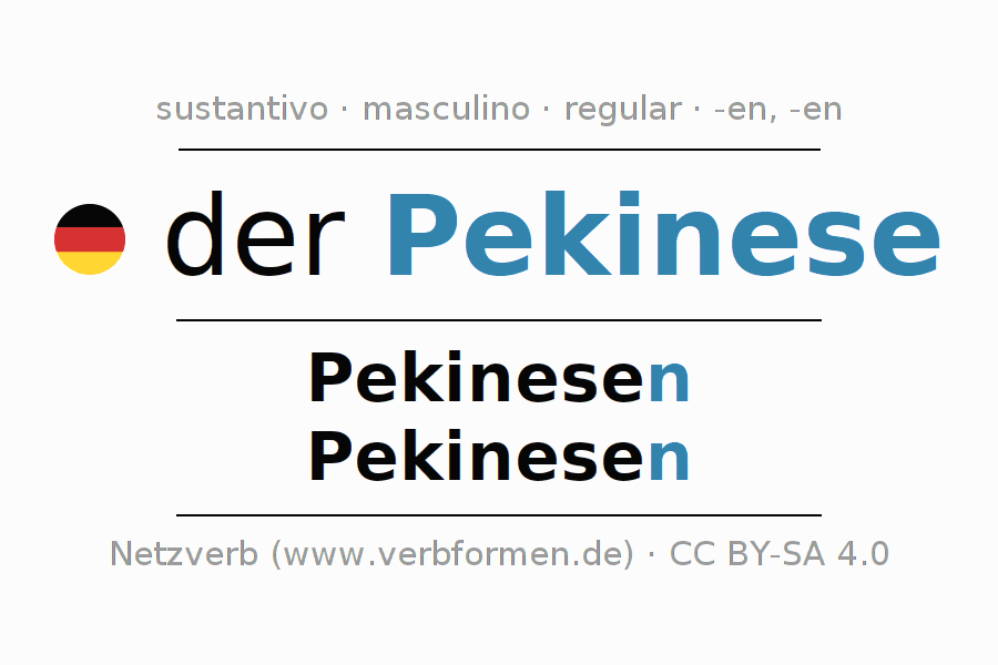La declinación del sustantivoPekinese (pekinés, pequinés) se encuentra en genitivoPekinesen del singular y en el nominativoPekinesen del plural. El sustantivo Pekinese se declina de forma débil con las terminaciones n/n. El género gramatical de Pekinese es masculino y por eso se requiere el artículo definido ‘der’. Aquí puedes declinar no solamente Pekinese sino también todos los sustantivos alemanes . Comentarios ☆