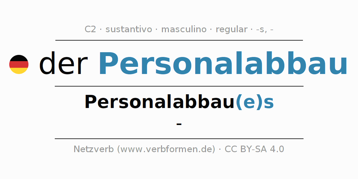 La declinación del sustantivo en forma de tabla con todas su formas: singular, plural y en los cuatro casos: nominativo (primer caso), genitivo (segundo caso), dativo (tercer caso) y acusativo (cuarto caso). Las construcciones gramaticales están representadas de forma clara en una tabla sinópica. La inflexión de los sustantivos es una ayuda durante tareas, exámenes, para cursos de alemán, la universidad, el estudio del alemán como lengua extranjera o como segundo idioma y para estudiantes adultos. La declinación correcta de las palabras es especialmente importante para los que aprenden el idioma alemán. Aquí encontraras más información acerca del tema Wiktionary Personalabbau y aquí también a través del Duden Personalabbau.