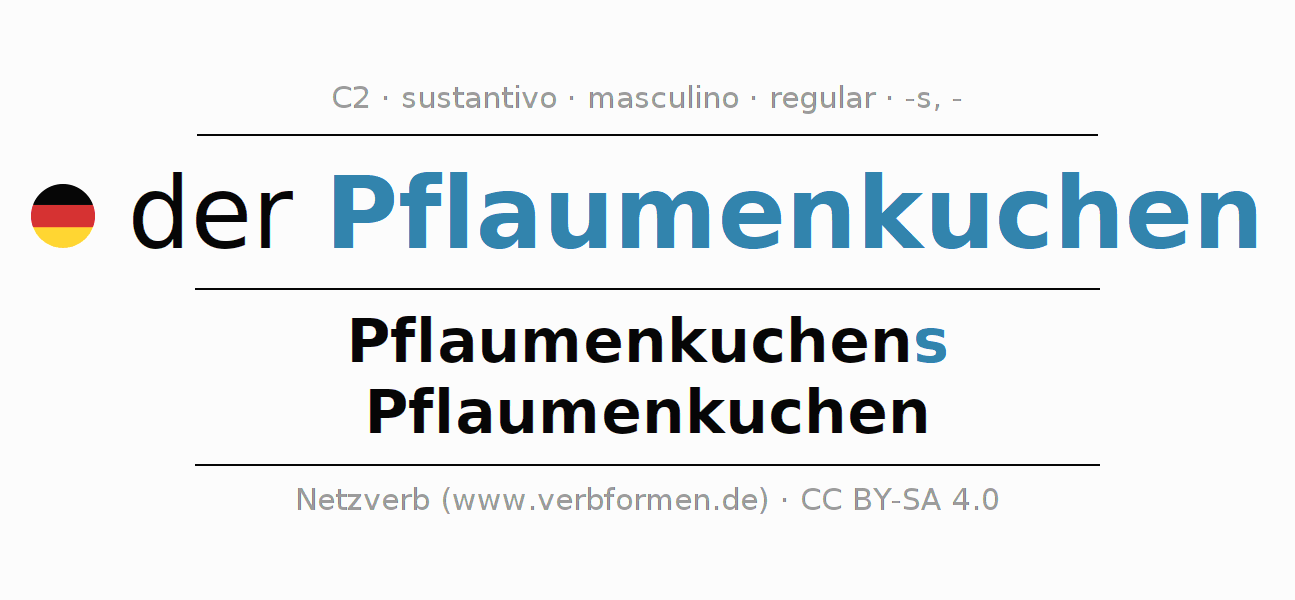 La declinación del sustantivo en forma de tabla con todas su formas: singular, plural y en los cuatro casos: nominativo (primer caso), genitivo (segundo caso), dativo (tercer caso) y acusativo (cuarto caso). Las construcciones gramaticales están representadas de forma clara en una tabla sinópica. La inflexión de los sustantivos es una ayuda durante tareas, exámenes, para cursos de alemán, la universidad, el estudio del alemán como lengua extranjera o como segundo idioma y para estudiantes adultos. La declinación correcta de las palabras es especialmente importante para los que aprenden el idioma alemán. Aquí encontraras más información acerca del tema Wiktionary Pflaumenkuchen y aquí también a través del Duden Pflaumenkuchen.