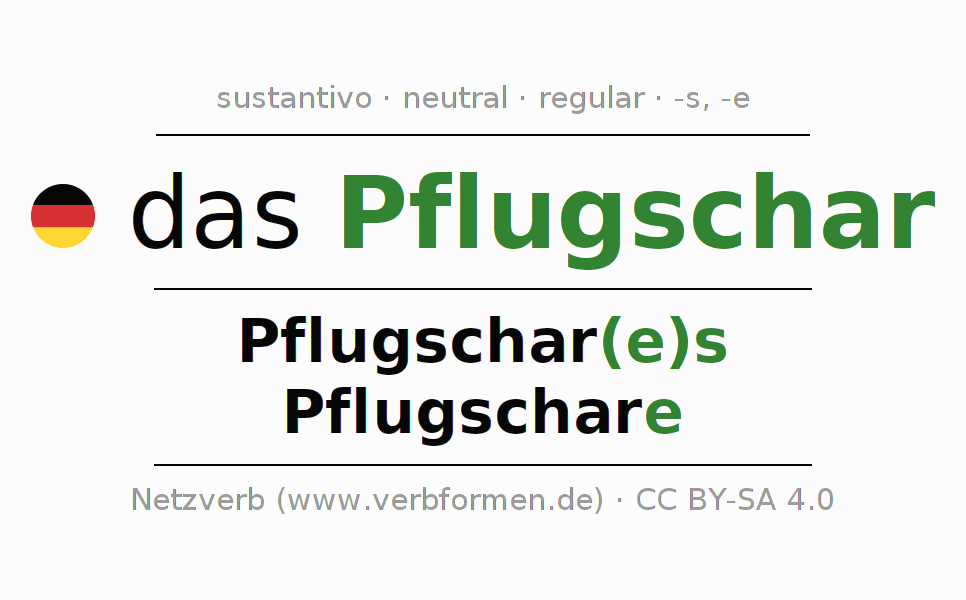 La declinación del sustantivo en forma de tabla con todas su formas: singular, plural y en los cuatro casos: nominativo (primer caso), genitivo (segundo caso), dativo (tercer caso) y acusativo (cuarto caso). Las construcciones gramaticales están representadas de forma clara en una tabla sinópica. La inflexión de los sustantivos es una ayuda durante tareas, exámenes, para cursos de alemán, la universidad, el estudio del alemán como lengua extranjera o como segundo idioma y para estudiantes adultos. La declinación correcta de las palabras es especialmente importante para los que aprenden el idioma alemán. Aquí encontraras más información acerca del tema Wiktionary das Pflugschar y aquí también a través del Duden das Pflugschar.