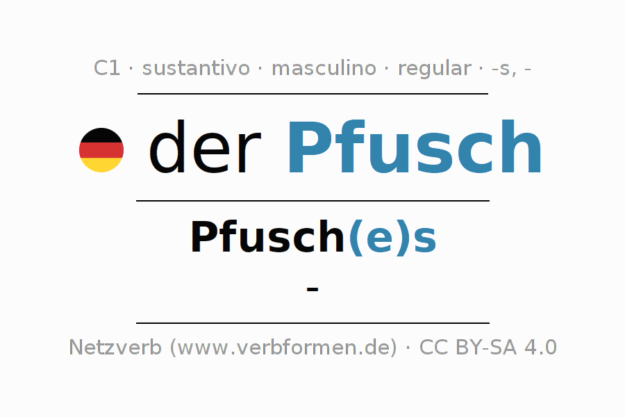 La declinación del sustantivoPfusch (chapuza, chapucería) se encuentra en genitivoPfusch(e)s del singular y en el nominativo- del plural. El sustantivo Pfusch se conjuga de forma fuerte (irregular) con estas terminaciones es/-. No permite construcciones en plural. El género gramatical de Pfusch es masculino y por eso se requiere el artículo definido ‘der’. Aquí puedes declinar no solamente Pfusch sino también todos los sustantivos alemanes . Este sustantivo pertenece al vocabulario necesario para pasar el examen "Zertifikat Deutsch" o para el nivel C1. Comentarios ☆