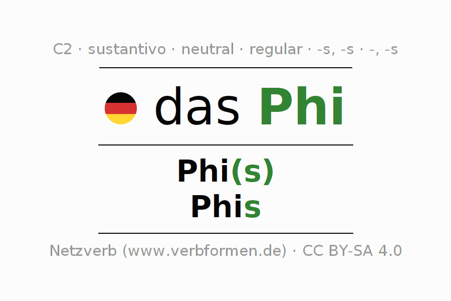 La declinación del sustantivoPhi se encuentra en genitivoPhi(s) del singular y en el nominativoPhis del plural. El sustantivo Phi se conjuga de forma fuerte (irregular) con estas terminaciones s/-/s. El género gramatical de Phi es neutro y por eso se requiere el artículo definido ‘das’. Aquí puedes declinar no solamente Phi sino también todos los sustantivos alemanes . Este sustantivo pertenece al vocabulario necesario para pasar el examen "Zertifikat Deutsch" o para el nivel C2. Comentarios ☆