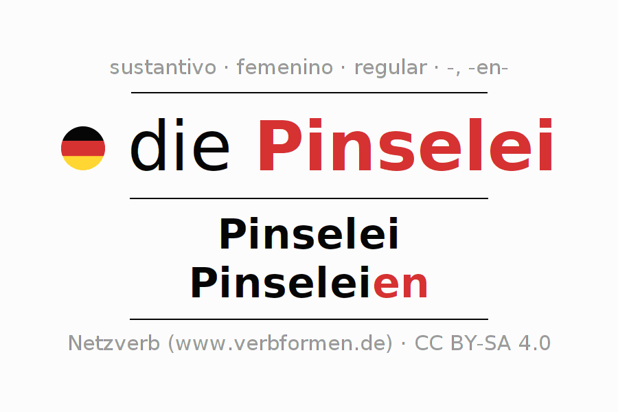 La declinación del sustantivo en forma de tabla con todas su formas: singular, plural y en los cuatro casos: nominativo (primer caso), genitivo (segundo caso), dativo (tercer caso) y acusativo (cuarto caso). Las construcciones gramaticales están representadas de forma clara en una tabla sinópica. La inflexión de los sustantivos es una ayuda durante tareas, exámenes, para cursos de alemán, la universidad, el estudio del alemán como lengua extranjera o como segundo idioma y para estudiantes adultos. La declinación correcta de las palabras es especialmente importante para los que aprenden el idioma alemán. Aquí encontraras más información acerca del tema Wiktionary Pinselei y aquí también a través del Duden Pinselei.