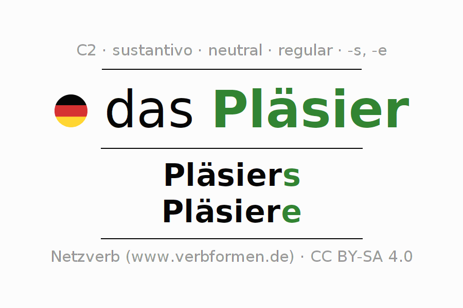 La declinación del sustantivo en forma de tabla con todas su formas: singular, plural y en los cuatro casos: nominativo (primer caso), genitivo (segundo caso), dativo (tercer caso) y acusativo (cuarto caso). Las construcciones gramaticales están representadas de forma clara en una tabla sinópica. La inflexión de los sustantivos es una ayuda durante tareas, exámenes, para cursos de alemán, la universidad, el estudio del alemán como lengua extranjera o como segundo idioma y para estudiantes adultos. La declinación correcta de las palabras es especialmente importante para los que aprenden el idioma alemán. Aquí encontraras más información acerca del tema Wiktionary Pläsier y aquí también a través del Duden Pläsier.