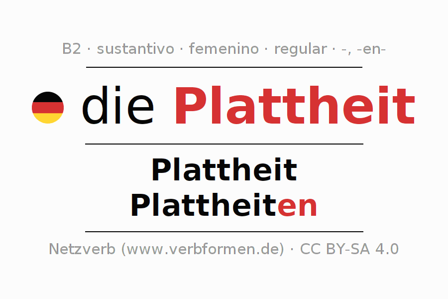 La declinación del sustantivo en forma de tabla con todas su formas: singular, plural y en los cuatro casos: nominativo (primer caso), genitivo (segundo caso), dativo (tercer caso) y acusativo (cuarto caso). Las construcciones gramaticales están representadas de forma clara en una tabla sinópica. La inflexión de los sustantivos es una ayuda durante tareas, exámenes, para cursos de alemán, la universidad, el estudio del alemán como lengua extranjera o como segundo idioma y para estudiantes adultos. La declinación correcta de las palabras es especialmente importante para los que aprenden el idioma alemán. Aquí encontraras más información acerca del tema Wiktionary Plattheit y aquí también a través del Duden Plattheit.