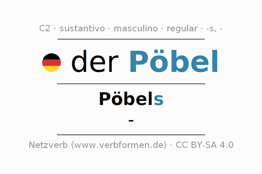 La declinación del sustantivo en forma de tabla con todas su formas: singular, plural y en los cuatro casos: nominativo (primer caso), genitivo (segundo caso), dativo (tercer caso) y acusativo (cuarto caso). Las construcciones gramaticales están representadas de forma clara en una tabla sinópica. La inflexión de los sustantivos es una ayuda durante tareas, exámenes, para cursos de alemán, la universidad, el estudio del alemán como lengua extranjera o como segundo idioma y para estudiantes adultos. La declinación correcta de las palabras es especialmente importante para los que aprenden el idioma alemán. Aquí encontraras más información acerca del tema Wiktionary Pöbel y aquí también a través del Duden Pöbel.