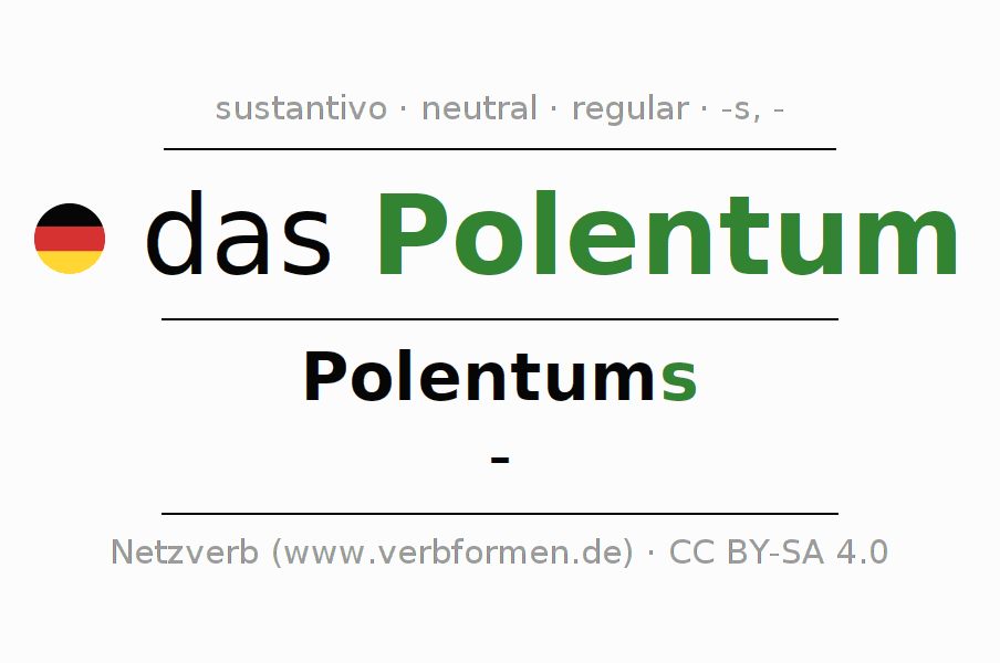 La declinación del sustantivoPolentum se encuentra en genitivoPolentums del singular y en el nominativo- del plural. El sustantivo Polentum se conjuga de forma fuerte (irregular) con estas terminaciones s/-. No permite construcciones en plural. El género gramatical de Polentum es neutro y por eso se requiere el artículo definido ‘das’. Aquí puedes declinar no solamente Polentum sino también todos los sustantivos alemanes . Comentarios ☆