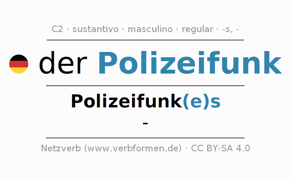 La declinación del sustantivoPolizeifunk (comunicaciones policiales, radio policial) se encuentra en genitivoPolizeifunk(e)s del singular y en el nominativo- del plural. El sustantivo Polizeifunk se conjuga de forma fuerte (irregular) con estas terminaciones es/s/-. No permite construcciones en plural. El género gramatical de Polizeifunk es masculino y por eso se requiere el artículo definido ‘der’. Aquí puedes declinar no solamente Polizeifunk sino también todos los sustantivos alemanes . Este sustantivo pertenece al vocabulario necesario para pasar el examen "Zertifikat Deutsch" o para el nivel C2. Comentarios ☆