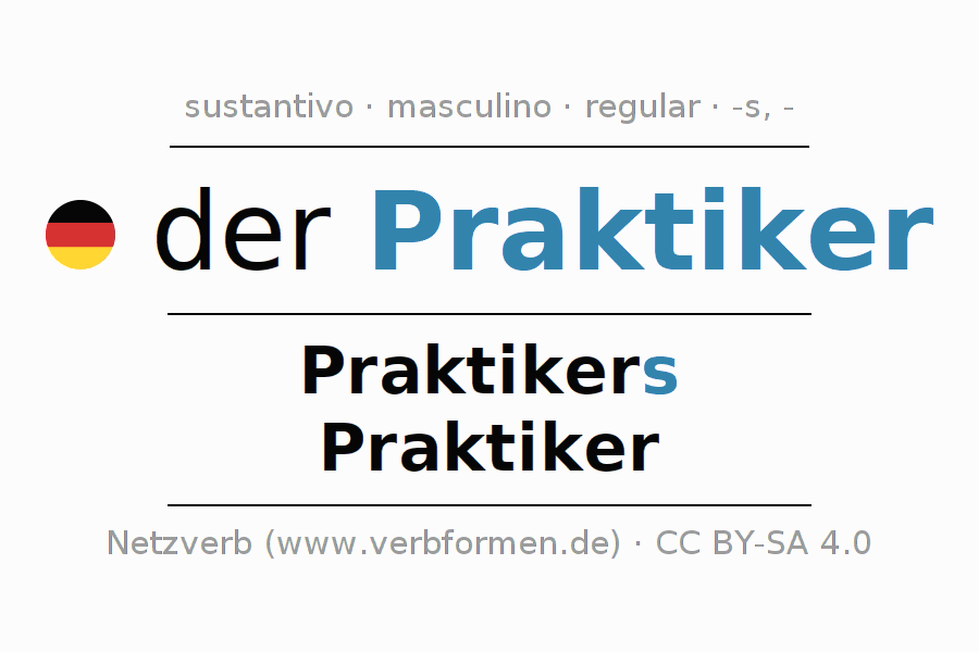 La declinación del sustantivoPraktiker (experto, practicante) se encuentra en genitivoPraktikers del singular y en el nominativoPraktiker del plural. El sustantivo Praktiker se conjuga de forma fuerte (irregular) con estas terminaciones s/-. El género gramatical de Praktiker es masculino y por eso se requiere el artículo definido ‘der’. Aquí puedes declinar no solamente Praktiker sino también todos los sustantivos alemanes . Comentarios ☆