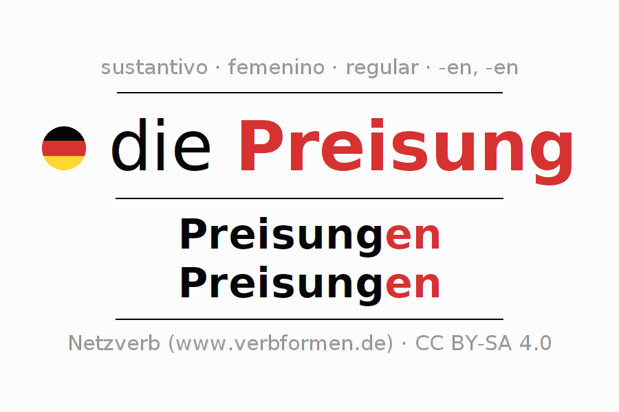 La declinación del sustantivo en forma de tabla con todas su formas: singular, plural y en los cuatro casos: nominativo (primer caso), genitivo (segundo caso), dativo (tercer caso) y acusativo (cuarto caso). Las construcciones gramaticales están representadas de forma clara en una tabla sinópica. La inflexión de los sustantivos es una ayuda durante tareas, exámenes, para cursos de alemán, la universidad, el estudio del alemán como lengua extranjera o como segundo idioma y para estudiantes adultos. La declinación correcta de las palabras es especialmente importante para los que aprenden el idioma alemán. Aquí encontraras más información acerca del tema Wiktionary Preisung y aquí también a través del Duden Preisung.