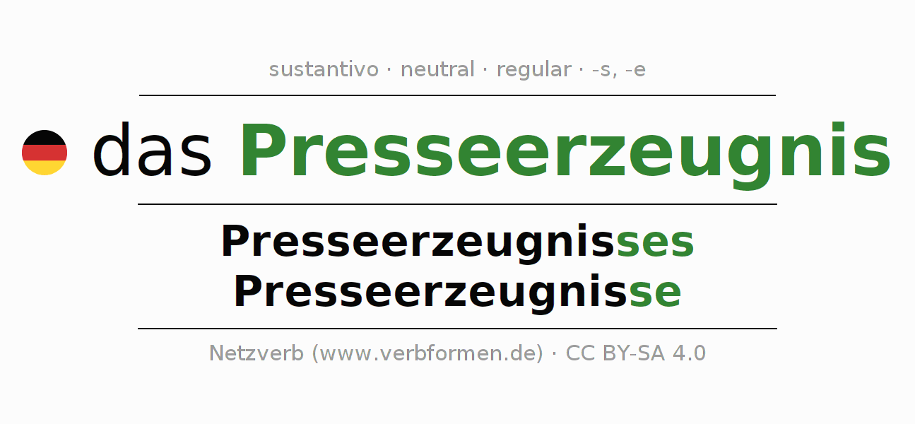 La declinación del sustantivo en forma de tabla con todas su formas: singular, plural y en los cuatro casos: nominativo (primer caso), genitivo (segundo caso), dativo (tercer caso) y acusativo (cuarto caso). Las construcciones gramaticales están representadas de forma clara en una tabla sinópica. La inflexión de los sustantivos es una ayuda durante tareas, exámenes, para cursos de alemán, la universidad, el estudio del alemán como lengua extranjera o como segundo idioma y para estudiantes adultos. La declinación correcta de las palabras es especialmente importante para los que aprenden el idioma alemán. Aquí encontraras más información acerca del tema Wiktionary Presseerzeugnis y aquí también a través del Duden Presseerzeugnis.