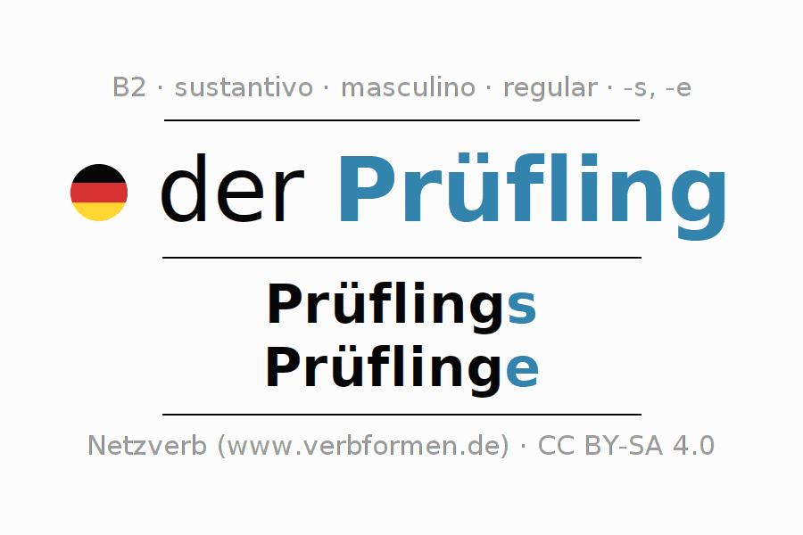 La declinación del sustantivo en forma de tabla con todas su formas: singular, plural y en los cuatro casos: nominativo (primer caso), genitivo (segundo caso), dativo (tercer caso) y acusativo (cuarto caso). Las construcciones gramaticales están representadas de forma clara en una tabla sinópica. La inflexión de los sustantivos es una ayuda durante tareas, exámenes, para cursos de alemán, la universidad, el estudio del alemán como lengua extranjera o como segundo idioma y para estudiantes adultos. La declinación correcta de las palabras es especialmente importante para los que aprenden el idioma alemán. Aquí encontraras más información acerca del tema Wiktionary Prüfling y aquí también a través del Duden Prüfling.