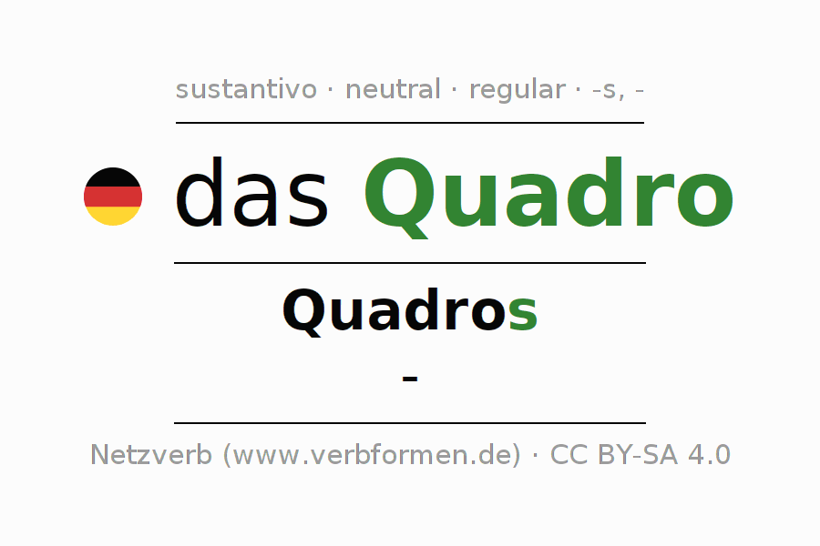La declinación del sustantivoQuadro se encuentra en genitivoQuadros del singular y en el nominativo- del plural. El sustantivo Quadro se conjuga de forma fuerte (irregular) con estas terminaciones s/-. No permite construcciones en plural. El género gramatical de Quadro es neutro y por eso se requiere el artículo definido ‘das’. Aquí puedes declinar no solamente Quadro sino también todos los sustantivos alemanes . Comentarios ☆