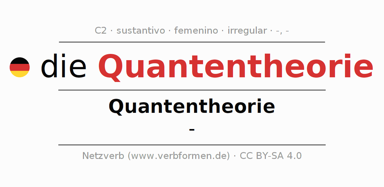 La declinación del sustantivo en forma de tabla con todas su formas: singular, plural y en los cuatro casos: nominativo (primer caso), genitivo (segundo caso), dativo (tercer caso) y acusativo (cuarto caso). Las construcciones gramaticales están representadas de forma clara en una tabla sinópica. La inflexión de los sustantivos es una ayuda durante tareas, exámenes, para cursos de alemán, la universidad, el estudio del alemán como lengua extranjera o como segundo idioma y para estudiantes adultos. La declinación correcta de las palabras es especialmente importante para los que aprenden el idioma alemán. Aquí encontraras más información acerca del tema Wiktionary Quantentheorie y aquí también a través del Duden Quantentheorie.