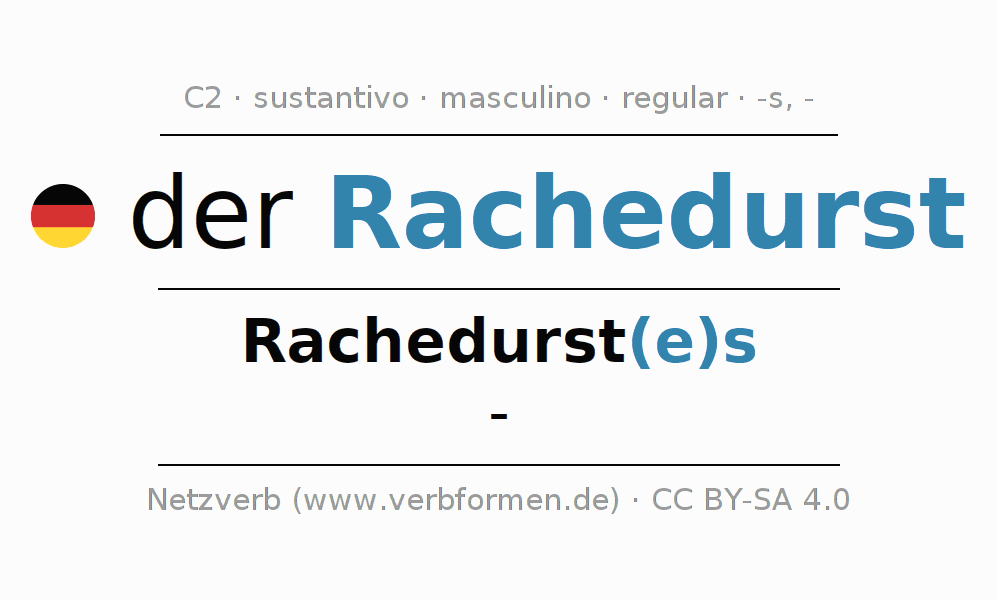 La declinación del sustantivoRachedurst (sed de venganza) se encuentra en genitivoRachedurst(e)s del singular y en el nominativo- del plural. El sustantivo Rachedurst se conjuga de forma fuerte (irregular) con estas terminaciones es/-. No permite construcciones en plural. El género gramatical de Rachedurst es masculino y por eso se requiere el artículo definido ‘der’. Aquí puedes declinar no solamente Rachedurst sino también todos los sustantivos alemanes . Este sustantivo pertenece al vocabulario necesario para pasar el examen "Zertifikat Deutsch" o para el nivel C2. Comentarios ☆