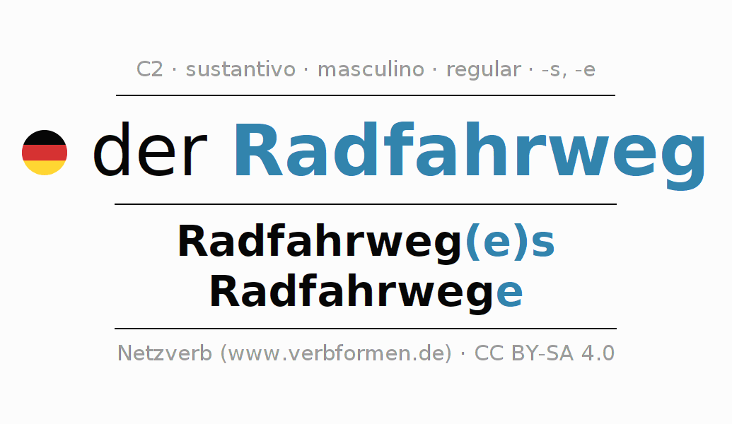 La declinación del sustantivo en forma de tabla con todas su formas: singular, plural y en los cuatro casos: nominativo (primer caso), genitivo (segundo caso), dativo (tercer caso) y acusativo (cuarto caso). Las construcciones gramaticales están representadas de forma clara en una tabla sinópica. La inflexión de los sustantivos es una ayuda durante tareas, exámenes, para cursos de alemán, la universidad, el estudio del alemán como lengua extranjera o como segundo idioma y para estudiantes adultos. La declinación correcta de las palabras es especialmente importante para los que aprenden el idioma alemán. Aquí encontraras más información acerca del tema Wiktionary Radfahrweg y aquí también a través del Duden Radfahrweg.