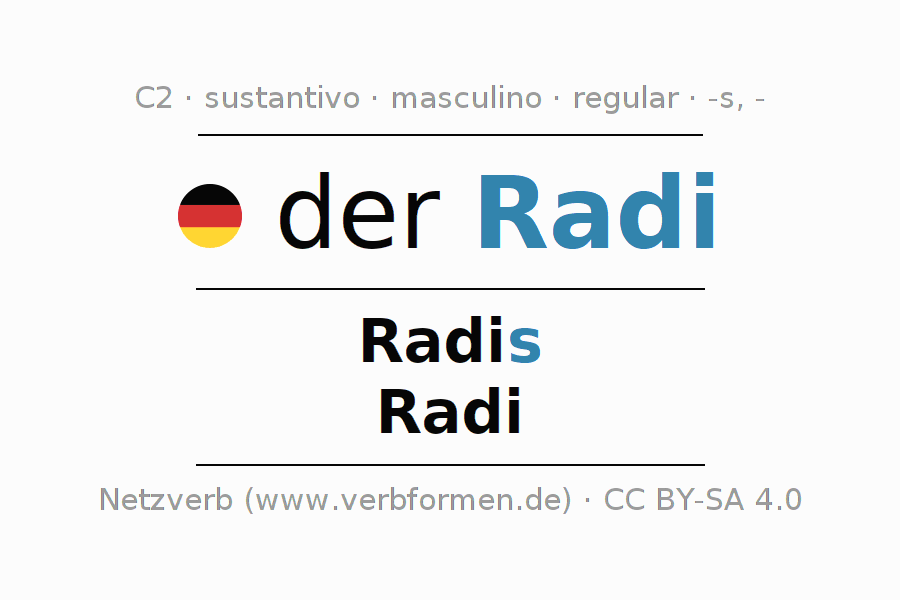 La declinación del sustantivoRadi (rábano) se encuentra en genitivoRadis del singular y en el nominativoRadi del plural. El sustantivo Radi se conjuga de forma fuerte (irregular) con estas terminaciones s/-. El género gramatical de Radi es masculino y por eso se requiere el artículo definido ‘der’. Aquí puedes declinar no solamente Radi sino también todos los sustantivos alemanes . Este sustantivo pertenece al vocabulario necesario para pasar el examen "Zertifikat Deutsch" o para el nivel C2. Comentarios ☆
