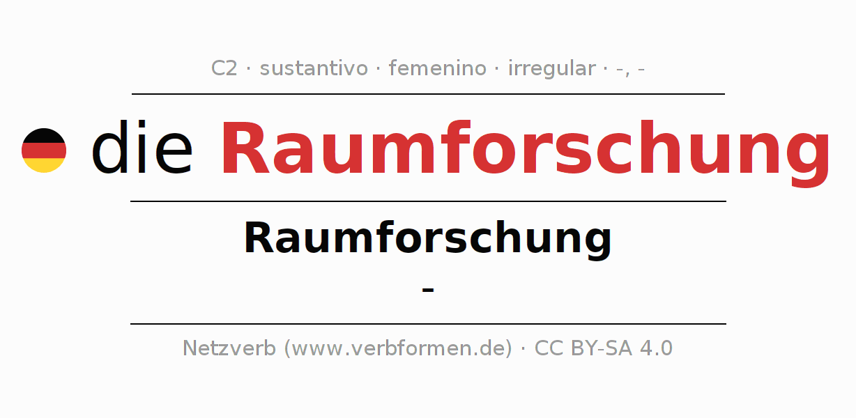 La declinación del sustantivoRaumforschung (investigación espacial, exploración espacial) se encuentra en genitivoRaumforschung del singular y en el nominativo- del plural. El sustantivo Raumforschung se declina con las terminaciones -/-. No permite construcciones en plural. El género gramatical de Raumforschung es femenino y por eso se requiere el artículo definido ‘die’. Aquí puedes declinar no solamente Raumforschung sino también todos los sustantivos alemanes . Este sustantivo pertenece al vocabulario necesario para pasar el examen "Zertifikat Deutsch" o para el nivel C2. Comentarios ☆