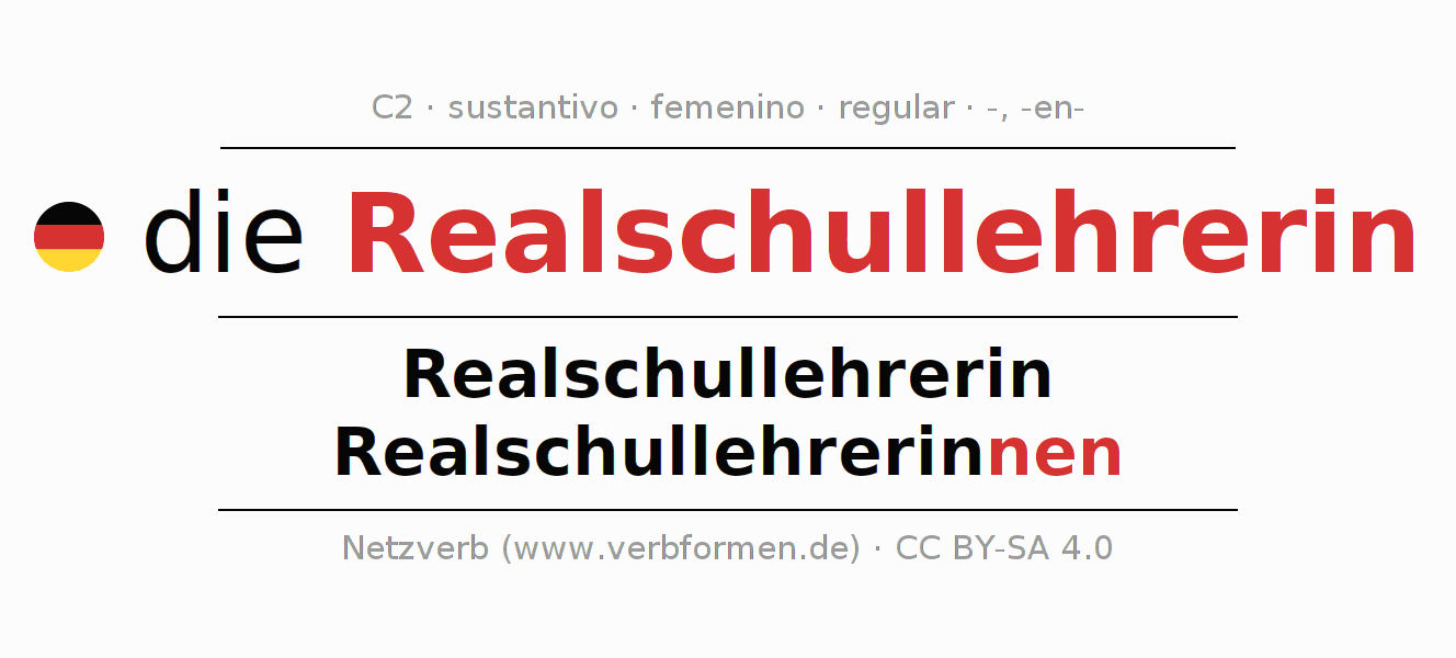 La declinación del sustantivo en forma de tabla con todas su formas: singular, plural y en los cuatro casos: nominativo (primer caso), genitivo (segundo caso), dativo (tercer caso) y acusativo (cuarto caso). Las construcciones gramaticales están representadas de forma clara en una tabla sinópica. La inflexión de los sustantivos es una ayuda durante tareas, exámenes, para cursos de alemán, la universidad, el estudio del alemán como lengua extranjera o como segundo idioma y para estudiantes adultos. La declinación correcta de las palabras es especialmente importante para los que aprenden el idioma alemán. Aquí encontraras más información acerca del tema Wiktionary Realschullehrerin y aquí también a través del Duden Realschullehrerin.