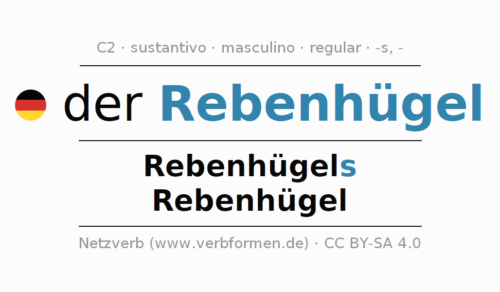 La declinación del sustantivoRebenhügel (colina de viñas) se encuentra en genitivoRebenhügels del singular y en el nominativoRebenhügel del plural. El sustantivo Rebenhügel se conjuga de forma fuerte (irregular) con estas terminaciones s/-. El género gramatical de Rebenhügel es masculino y por eso se requiere el artículo definido ‘der’. Aquí puedes declinar no solamente Rebenhügel sino también todos los sustantivos alemanes . Este sustantivo pertenece al vocabulario necesario para pasar el examen "Zertifikat Deutsch" o para el nivel C2. Comentarios ☆